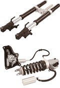 大型3輪モーターサイクル用フロントフォーク 大型3輪モーターサイクル用の倒立片持ちフロントフォークです。「2輪車同等の楽しさや使い勝手の良さ」と「2輪車以上の高い安定性」という優れた特性を生かし、より安全な高速移動やスポーツ走行用として開発したフロントフォークです。