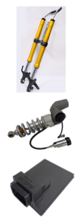 電子制御サスペンションシステム“KADS” (KADS:KYB Actimatic Damper System) 走る、曲がる、止まる等の様々なシーンに対し、獨自開発の『グランドフックコンセプト』による減衰力制御で、高い操縦安定性と接地感を達成した、フロントフォーク、リヤクッションユニット、エレクトロニックコントロールユニットからなるシステム製品です。