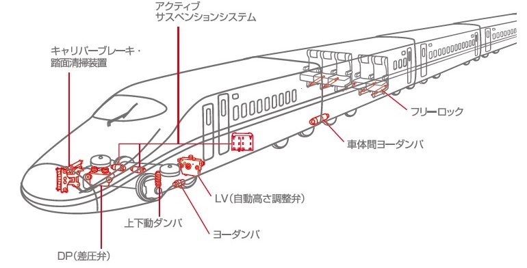 カーブ走行、対向車両とのすれ違いやトンネル突入時の風圧による橫揺れを緩衝し、高速走行時における快適さを実現させるカヤバの鉄道用機器。